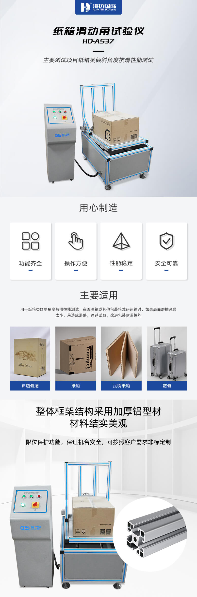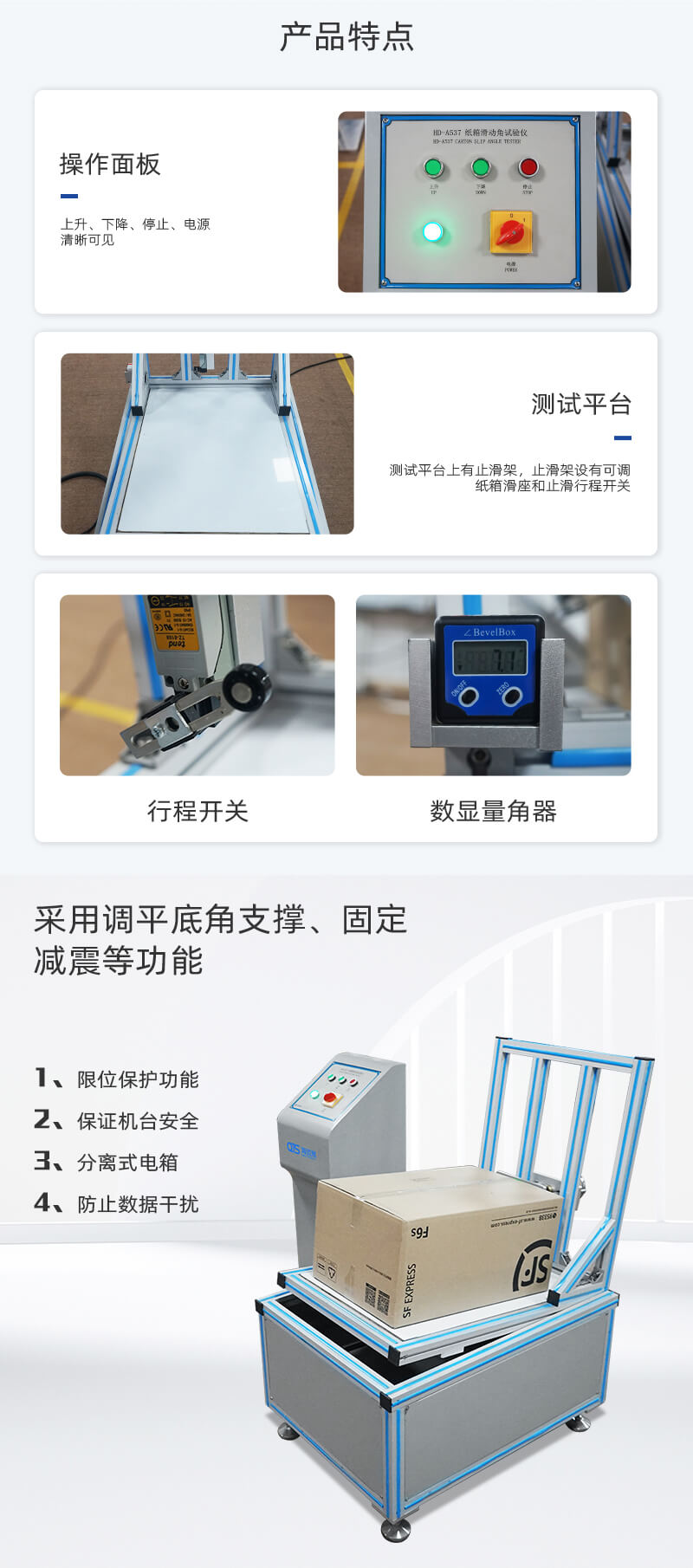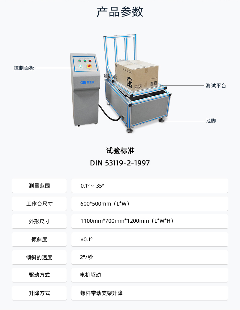 紙箱滑動角試驗儀將紙箱滑動角測試儀用于紙箱類傾斜角度抗滑性能測試,在啤酒箱或其他包裝箱堆碼運輸時,如果表面磨擦系數(shù)太小,易造成滑落,通過試驗,改進包裝耐滑性能。
