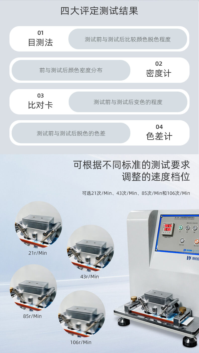 印刷油墨脫色耐磨試驗儀主要適用于印刷品印刷墨層耐磨性測試。將標準尺寸的摩擦紙包于摩擦頭,以規(guī)定的速度、壓力等對試樣表面進行摩擦,觀察試樣墨層脫落情況。