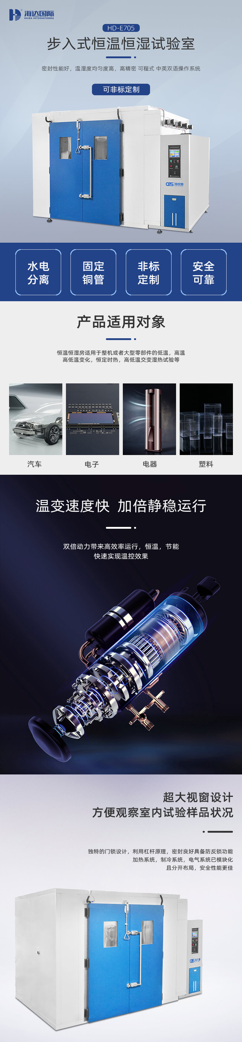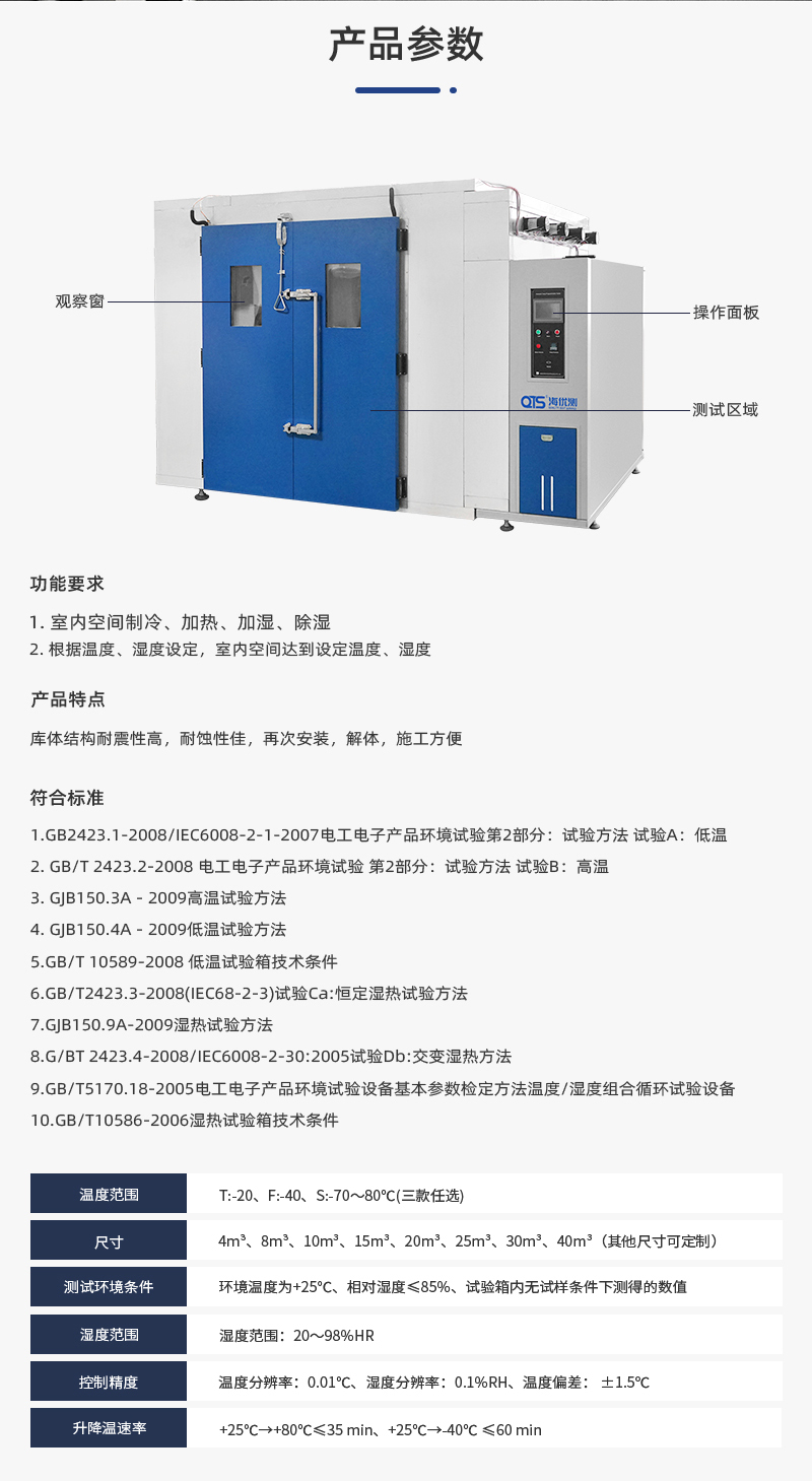 恒溫恒濕試驗房又名步入式恒溫恒濕試驗室,適用于整機或大型零部件的低溫、高溫、高低溫變化、恒定濕熱、高低溫交變濕熱試驗等??筛鶕?jù)用戶要求改變工作室尺寸與功能等;拼塊式箱體,造型美觀大方;科學(xué)的風(fēng)道設(shè)計,能滿足不同客戶的需求;采用觸摸屏,PLC程控器。