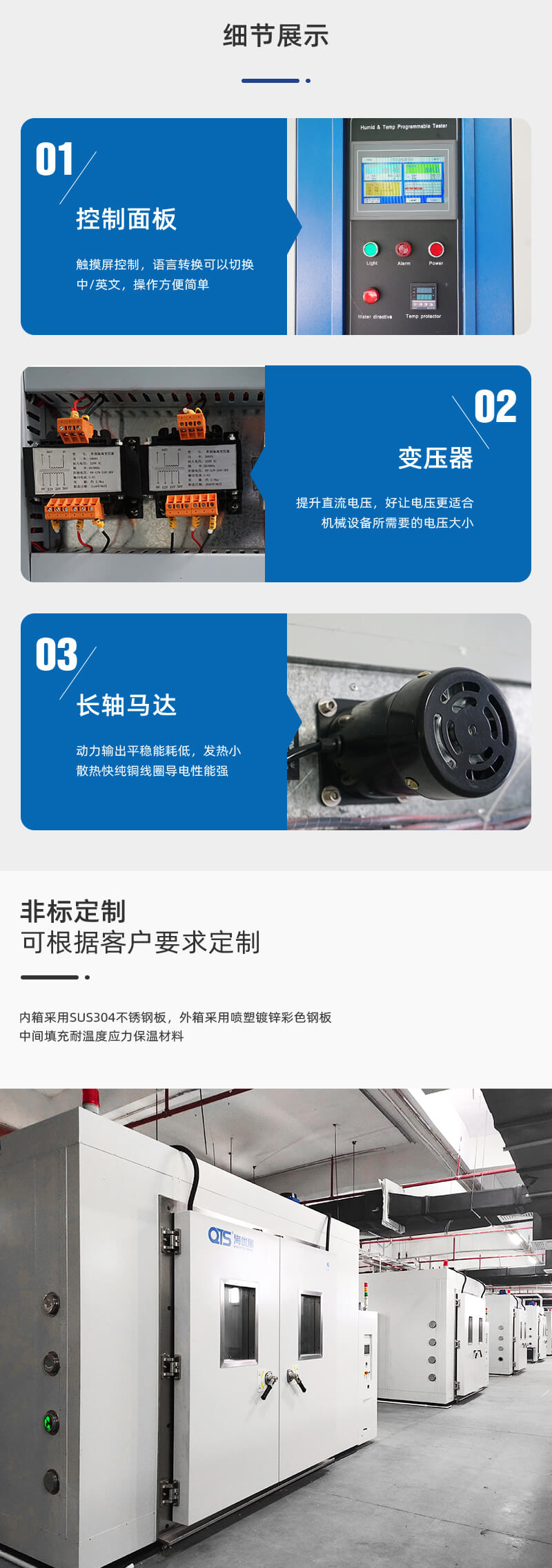 內(nèi)置空氣間、循環(huán)風(fēng)道及不銹鋼循環(huán)風(fēng)機,通過頂部背葉窗及散流器,風(fēng)均勻的從頂部吹出,將調(diào)和室中調(diào)和好的溫度散發(fā)到測試空間,從而達到均勻的控制溫度的目的 |