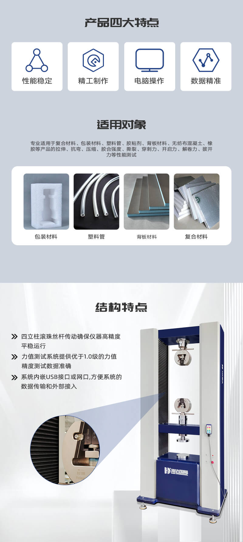 金屬材料萬能拉力機適用于復合材料、包裝材料、塑料管、膠粘劑、背板材料、無紡布、混凝土、橡膠等高強度非金屬材料和醫(yī)療器械、線纜、鋼材等金屬產(chǎn)品的拉伸、抗彎、壓縮、膠合強度、撕裂、穿刺力、開啟力、解卷力、拔開力等性能測試。