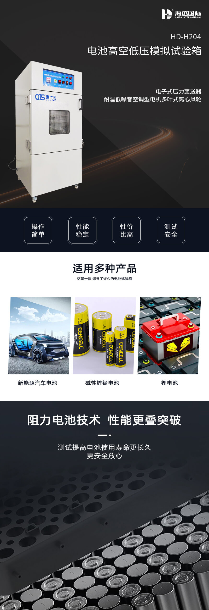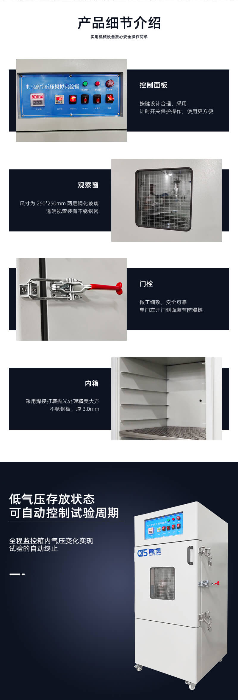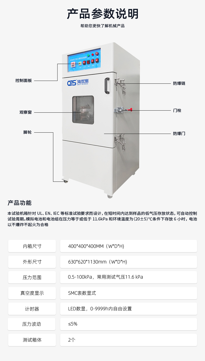 電池高空低壓模擬試驗箱針對UL、EN、IEC等標準試驗而設計,在短時間內達到樣品的低氣壓存放狀態(tài),可自動控制試驗周期,全程監(jiān)控箱內氣壓變化,實現(xiàn)試驗的自動終止。模擬電池和電池組在壓力等于或低于11.6kPa和環(huán)境溫度為(20±5)℃條件下存放6小時,電池以不爆炸不起火為合格。